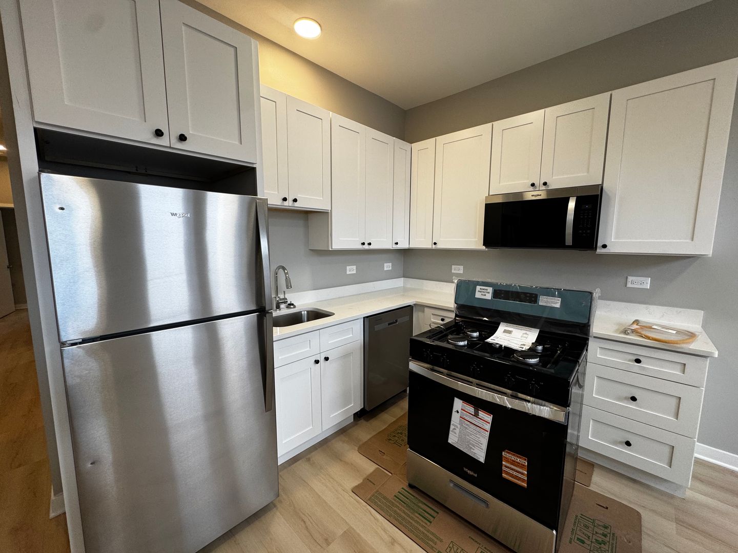 The eat-in kitchen has white cabinetry, Carrera like countertops, stainless steel fridge, oven, microwave and dishwasher. Be the first to use it.