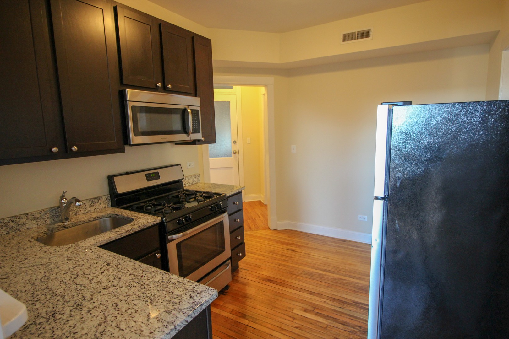 Kitchen Complete w/ Light Granite Counter Tops, Frigidair Stainless Steel Appliances, and Dark Wood Cabinets.
