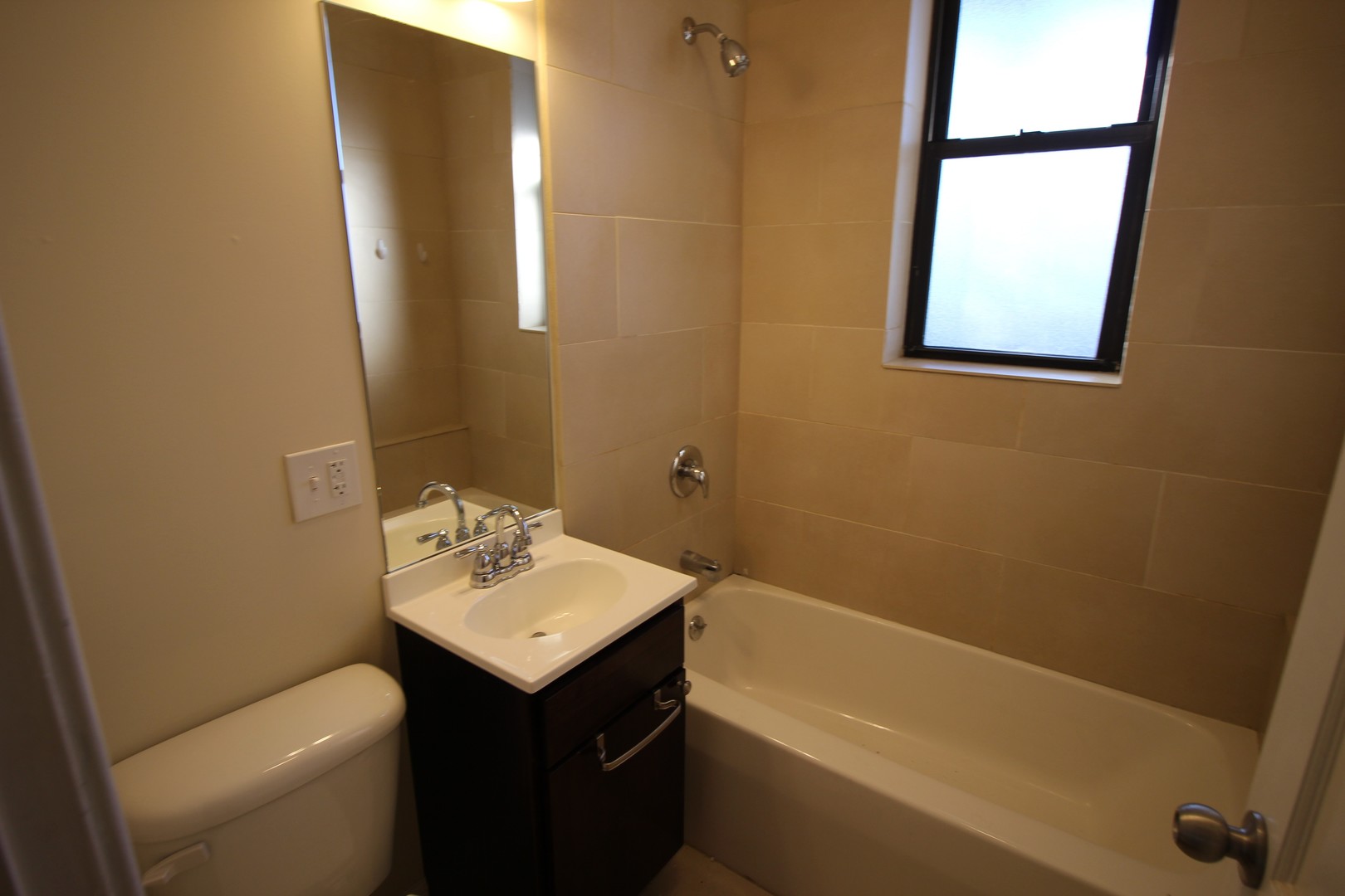 Bathroom w/ dark wood vanity, brand new toilet, lighting, and fixtures as well as spa-like tiling