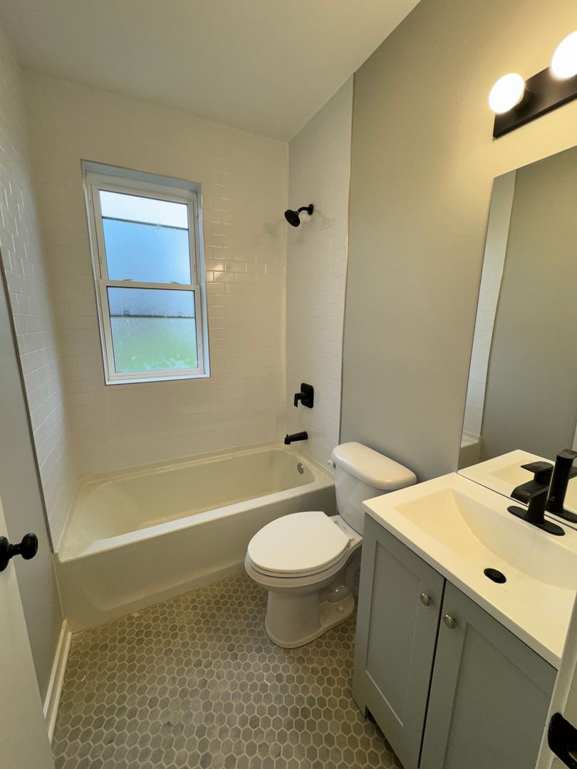 Beautiful Grey Bathroom Tile with New Tub and Fixtures