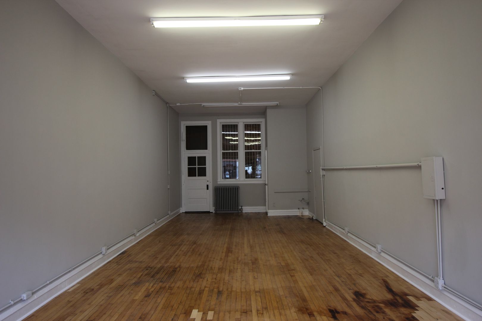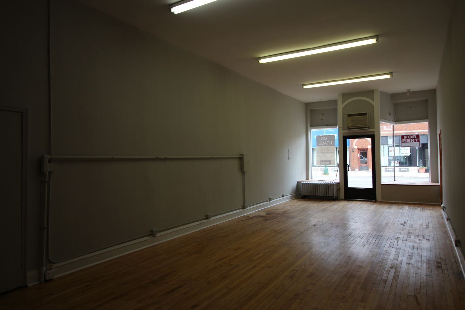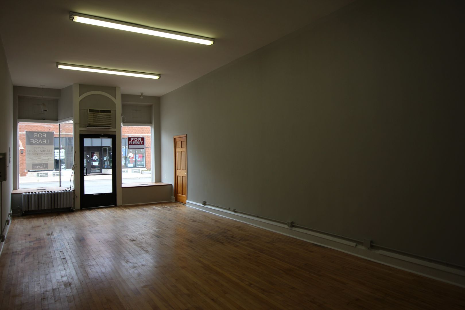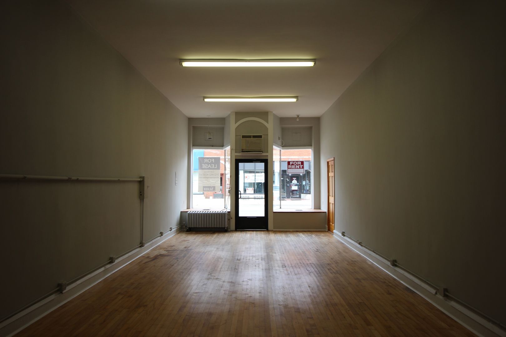 The space features fresh gray paint, refinished original hardwood floors, soaring ceilings, large front display windows, and a private restroom, creating a bright and welcoming environment for your business.
