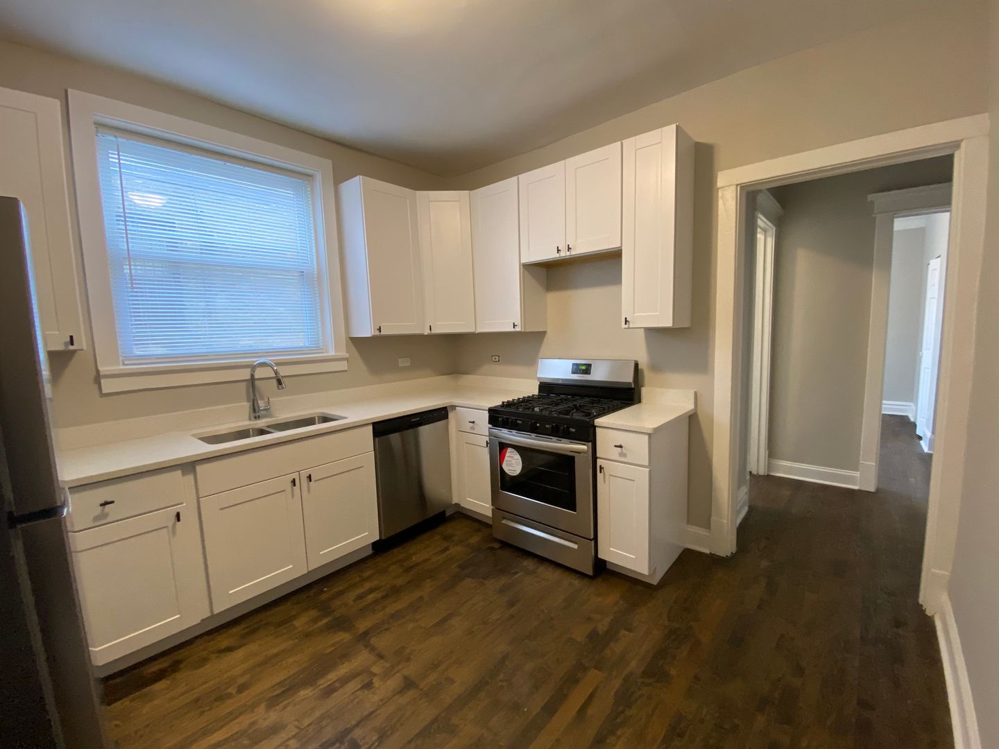 Gut Rehabbed Kitchen with new white cabinets, quartz countertops and stainless steel appliances
